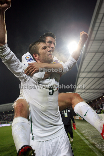 : Cesar Bostjan (L) and Koren Robert celebrating Slovenia victory after qualification match for FIFA World Cup 2010 in South Africa. Match between Slovenia and Russia was played on 18th of November 2009 in Maribor, Slovenia. Slovenia defeated Russia with 1:0 and qualified for FIFA World Cup 2010 in South Africa.