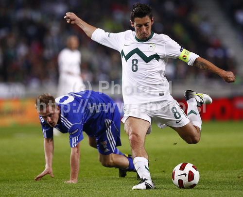 : Robert Koren of Slovenia shooting during football match of UEFA European championships qualifications between Slovenia and Faroe Islands. Match between Slovenia and Faroe Islands was played on Friday, 8th of October 2010 in Stozice arena in Ljubljana, Slovenia.
