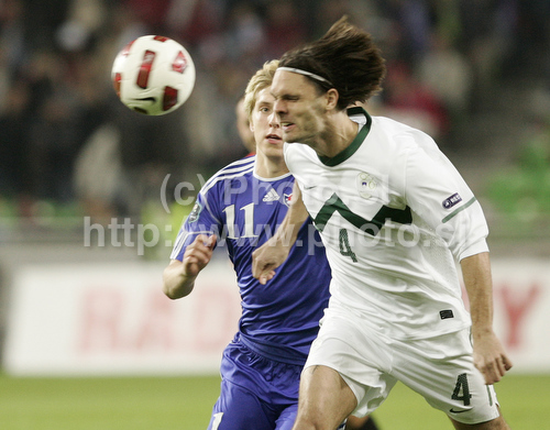 Ljubljana ,Slovenia - 08.10.2010 : Joan Edmundsson of Faroe Islands (L) and Marko Suler of Slovenia during football match of UEFA European championships qualifications between Slovenia and Faroe Islands. Match between Slovenia and Faroe Islands was played on Friday, 8th of October 2010 in Stozice arena in Ljubljana, Slovenia. Photo by: Leena Jeroncic
