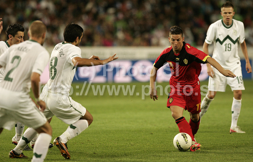 : Dries Mertens of Belgium (R) trying to get by Robert Koren (M) and Miso Brecko (L) of Slovenia during friendly football match between Slovenia and Belgium. Match between Slovenia and Belgium was played on Wednesday, 10th of August 2011 in Stozice arena in Ljubljana, Slovenia.