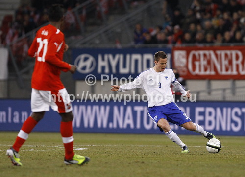 : Niklas Moisander (no.3) of Finland (R) during friendly football match between Austria and Finland. Friendly football match between Austria and Finland, was played on Wednesday, 29th of February 2012, on Worthersee Stadium in Klagenfurt, Austria.