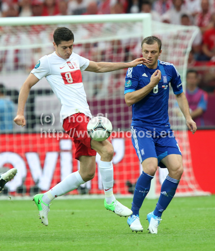 : Robert Lewandowski of Poland and Avraam Papadopoulos of Greece during UEFA Football Euro 2012 match between Poland and Greece. Match of UEFA Football European Championships 2012 between Poland and Greece was played on Friday, 9th of June 2012 in Warszawa, Poland.