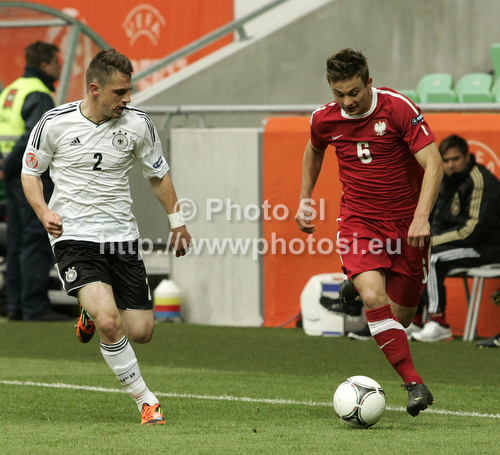 Ljubljana ,Slovenia - 13.05.2012 : Karol Linetty of Poland (R) and Pascal Itter of Germany (L) during football half final match of UEFA U17 European championships between Germany and Poland. Half final match of UEFA U17 European championships football between Germany and Poland, was played on Sunday, 13th of May 2012, in Stozice Stadium in Ljubljana, Slovenia. Photo by: Leena Jeroncic