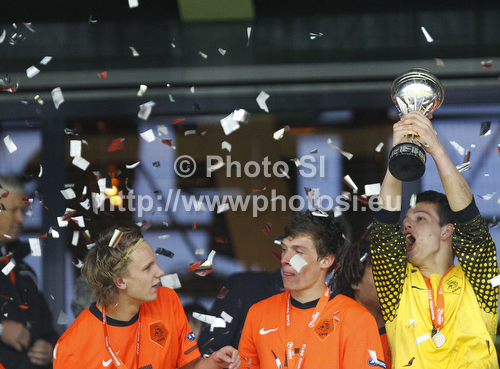 : Goalie Nick Olij of Netherlands with his teammates celebrate their victory trophy after end of football final match of UEFA U17 European championships between Germany and Netherlands. Final match of UEFA U17 European championships football between Germany and Netherlands, was played on Wednesday, 16th of May 2012, in Stozice Stadium in Ljubljana, Slovenia.