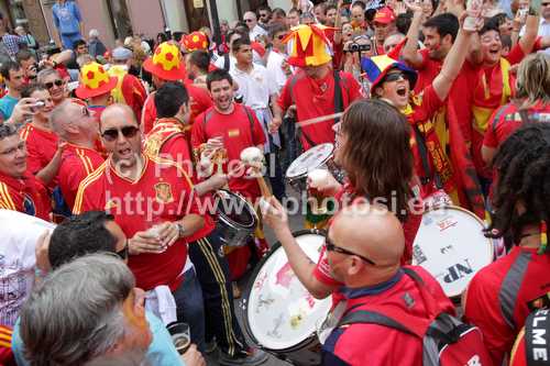 : Spanish fans before start of UEFA Football Euro 2012 match between Italy and Spain. Match of UEFA Football European Championships 2012 between Italy and Spain was played on Sunday, 10th of June 2012 in Gdansk, Poland.