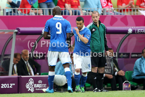 : Mario Balotelli and Antonio Di Natale of Italy during UEFA Football Euro 2012 match between Italy and Spain. Match of UEFA Football European Championships 2012 between Italy and Spain was played on Sunday, 10th of June 2012 in Gdansk, Poland.