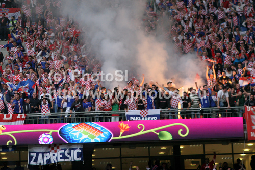 Poznan ,Poland - 14.06.2012 : Croatian fans throwing fire torches to field during UEFA Football Euro 2012 match between Italy and Croatia. Match of UEFA Football European Championships 2012 between Italy and Croatia was played on Thursday, 14th of June 2012 in Poznan, Poland. Photo by: Adam Jastrzebowski / PhotoSI