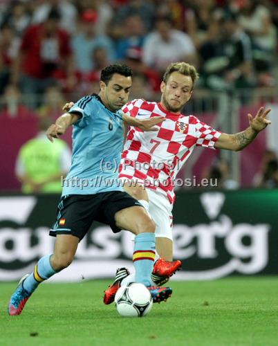 : Andres Iniesta of Spain, Ivan Rakitic of Croatia during UEFA Football Euro 2012 match between Croatia and Spain. Match of UEFA Football European Championships 2012 between Croatia and Spain was played on Monday, 18th of June 2012 in Gdansk, Poland.