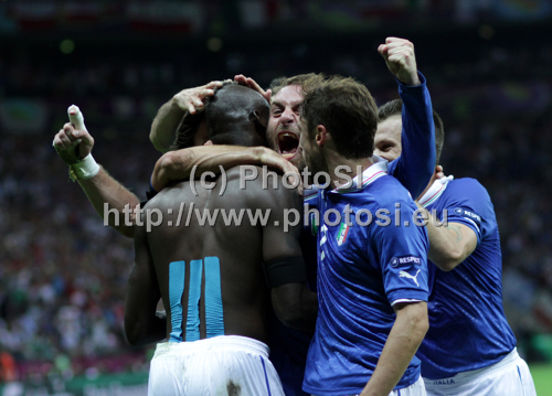 : Mario Balotelli of Italy celebrating 2nd goal during UEFA Football Euro 2012 semi final match between Italy and Germany. Match of UEFA Football European Championships 2012 between Italy and Germany was played on Thursday, 28th of June 2012 in Warsaw, Poland.