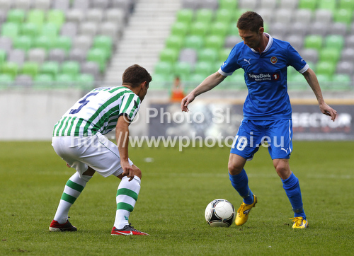 : Thomas Drage of Tromso IL (R) and Boban Jovic of NK Olimpija (L) during football match of second qualifying round of UEFA Europa League between NK Olimpija, Slovenia and Tromso IL, Norway. Match of second qualifying round of UEFA Europa League between NK Olimpija and Tromso IL was played in Stozice arena in Ljubljana, Slovenia, on Thursday, 19th of July 2012.