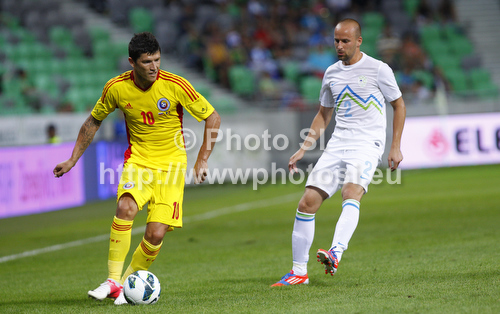 : Cristian Tanase (no.10) of Romania (L) and Miso Brecko (no.2) of Slovenia (R) during friendly football match between Slovenia and Romania. Match between Slovenia and Romania was played in Stozice arena in Ljubljana, Slovenia, on Wednesday, 15th of August 2012.