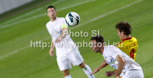 Ljubljana ,Slovenia - 15.08.2012 : Tim Matavz (no.23) of Slovenia (L) and Costin Lazar (no.8) of Romania (R) jumping for ball during friendly football match between Slovenia and Romania. Match between Slovenia and Romania was played in Stozice arena in Ljubljana, Slovenia, on Wednesday, 15th of August 2012. Photo by: Primoz Jeroncic