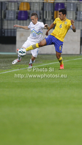 : Jiloan Hamad of Sweden (R) and Dejan Trajkovski of Slovenia (L) during UEFA U-21 Euro 2013 qualification football match between Slovenia and Sweden. Match between Slovenia and Sweden was played in Ljudski Vrt arena in Maribor, Slovenia, on Thursday, 6th of September 2012.