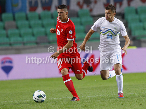 : Granit Xhaka of Switzerland (L) and Zlatko Dedic of Slovenia (R) during FIFA World cup 2014 qualification football match between Slovenia and Switzerland. Match between Slovenia and Switzerland was played in Stozice arena in Ljubljana, Slovenia, on Friday, 7th of September 2012.