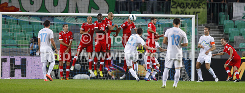 Ljubljana ,Slovenia - 07.09.2012 : Armin Bacinovic of Slovenia shooting free kick during FIFA World cup 2014 qualification football match between Slovenia and Switzerland. Match between Slovenia and Switzerland was played in Stozice arena in Ljubljana, Slovenia, on Friday, 7th of September 2012. Photo by: Primoz Jeroncic