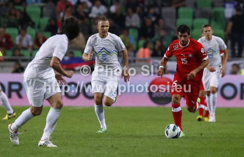 Ljubljana ,Slovenia - 07.09.2012 : Blerim Dzemaili of Switzerland between players of Slovenia during FIFA World cup 2014 qualification football match between Slovenia and Switzerland. Match between Slovenia and Switzerland was played in Stozice arena in Ljubljana, Slovenia, on Friday, 7th of September 2012. Photo by: Primoz Jeroncic