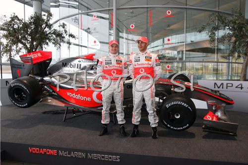 - 17.01.2009: Heikki Kovalainen (FIN) and Lewis Hamilton (GBR) with their McLaren Mercedes MP4-24 during presentation of new Mclaren Mercedes Formula 1 race car. Presentation of Mclaren Mercedes Formula 1 team was held in Woking, Great Britain, on 17th of January 2009.