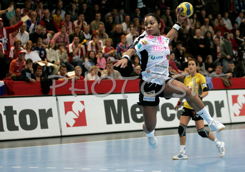 : Katty Piejos (no.10) of Metz Handball shooting on goal during second round match of Women Champions league between RK Krim, Ljubljana, Slovenia, and Metz Handball, Metz, France. Match between RK Krim and Metz Handball was played on 9th of November 2008 in Kodeljevo Arena in Ljubljana, Slovenia. Match ended with victory of Metz, who defeated RK Krim with 26:31.