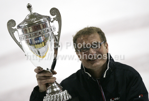 : Coach of HDD Tilia Olimpija, Hannu Jarvenpaa celebrating Slovenia Ice hockey National championships trophy after ice hockey match of Slovenian league finals 2011-2012 between HK Acroni Jesenice and HDD Tilia Olimpija. Match between HK Acroni Jesenice and HDD Tilia Olimpija was held on Monday, 2nd of April 2012 in Jesenice, Slovenia.