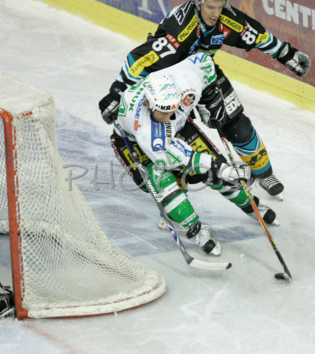 Ljubljana ,Slovenia - 28.02.2008 : Tomaz Vnuk (no.24) of ZM Olimpija (L) and Winfried Rac (no.87) of EHC Black Wings Linz (R) behind goal of EHC Black Wings Linz during second half finals match of EBEL League between ZM Olimpija, Ljubljana, Slovenia and EHC Black Wings Linz, Austria. Match was won by ZM Olimpija who defeated EHC Black Wings Linz with 3:2. Match was played in Tivoli Arena in Ljubljana, Slovenia on 28th of February 2008. Photo by: Primoz Jeroncic