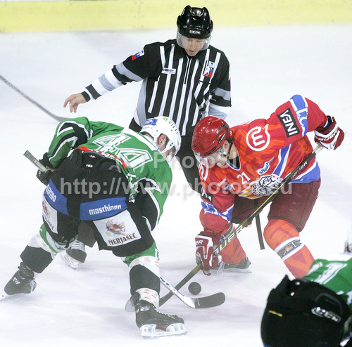 : Pretnar Klemen (no.21) of HK Jesenice (R) and John Hughes (no.44) of HDD Olimpija (L) during ice hockey match Summer League Rudi Hiti (Poletna liga Rudi Hiti) 2010 between HDD Tilia Olimpija and HK Acroni Jesenice. Match between HDD Tilia Olimpija and HK Acroni Jesenice was held on Friday, 20th of August 2010 in Ljubljana, Slovenia.