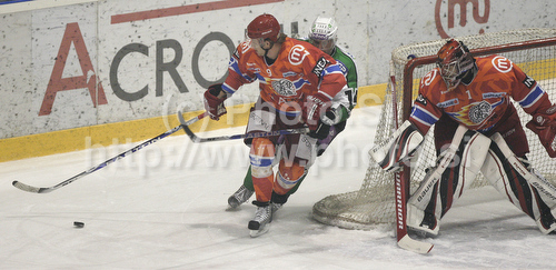 : Marc Cavosie HK Acroni Jesenice (L), Matej Hocevar of HDD Tilia Olimpija (M) and goalkeeper Jaakko Suomalainen HK Acroni Jesenice (R) during match of EBEL Ice hockey league between HK Acroni Jesenice, Slovenia, and HDD Tilia Olimpija, Ljubljana, Slovenia. Match between HK Acroni Jesenice and Tilia Olimpija was played in Podmezakla hall in Jesenice, Slovenia, on Saturday, 1st of January 2011.