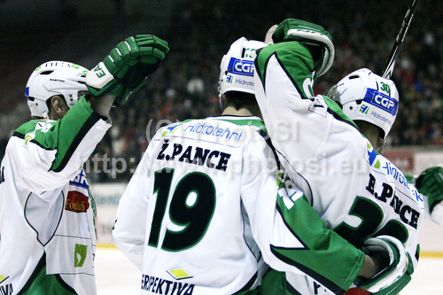 : Ziga Pance (no.19) of HDD Tilia Olimpija (M) celebrating his goal with teammates during ice hockey match of EBEL league 2011-2012 between HK Acroni Jesenice and HDD Tilia Olimpija. Match between HK Acroni Jesenice and HDD Tilia Olimpija was held on Monday, 26th of December 2011 in Jesenice, Slovenia.
