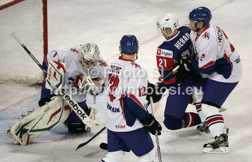 Ljubljana ,Slovenia - 15.04.2012 : Stephen Murphy (no.1) of Great Britain, Robert Dowd (no.12) of Great Britain, Andrej Hebar (no.21) of Slovenia during match of IIHF Ice hockey World championship Division 1 Group A between Slovenia and Great Britain. Match between Slovenia and Great Britain of IIHF Ice hockey World championship Division 1 Group A was held in Stozice Arena in Ljubljana, Slovenia, on Sunday, 15th of April 2012. Photo by: Leena Jeroncic
