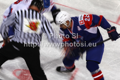 Ljubljana ,Slovenia - 15.04.2012 : Marcel Rodman (no.22) of Slovenia fighting for puck during match of IIHF Ice hockey World championship Division 1 Group A between Slovenia and Great Britain. Match between Slovenia and Great Britain of IIHF Ice hockey World championship Division 1 Group A was held in Stozice Arena in Ljubljana, Slovenia, on Sunday, 15th of April 2012. Photo by: Primoz Jeroncic