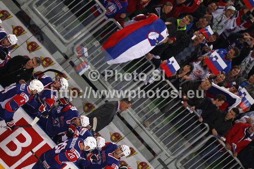 : Players of Slovenia celebrate their goal during match of IIHF Ice hockey World championship Division 1 Group A between Slovenia and Great Britain. Match between Slovenia and Great Britain of IIHF Ice hockey World championship Division 1 Group A was held in Stozice Arena in Ljubljana, Slovenia, on Sunday, 15th of April 2012.