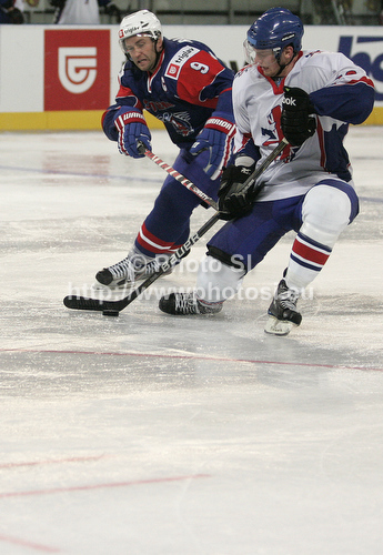 Ljubljana ,Slovenia - 15.04.2012 : David Phillips (no.13) of Great Britain (R) and Tomaz Razingar (no.9) of Slovenia (L) during match of IIHF Ice hockey World championship Division 1 Group A between Slovenia and Great Britain. Match between Slovenia and Great Britain of IIHF Ice hockey World championship Division 1 Group A was held in Stozice Arena in Ljubljana, Slovenia, on Sunday, 15th of April 2012. Photo by: Leena Jeroncic