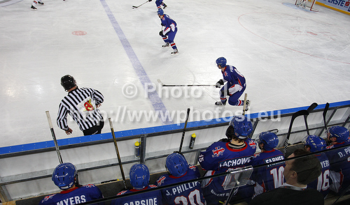 : Bench of Great Britain observing play during match of IIHF Ice hockey World championship Division 1 Group A between Austria and Great Britain. Match between Austria and Great Britain of IIHF Ice hockey World championship Division 1 Group A was held in Stozice Arena in Ljubljana, Slovenia, on Monday, 16th of April 2012.