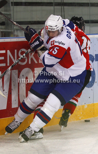 : Blaz Gregorc (no.15) of Slovenia (front) and Nikandrosz Galanisz (no.15) of Hungary (back) during match of IIHF Ice hockey World championship Division 1 Group A between Slovenia and Hungary. Match between Slovenia and Hungary of IIHF Ice hockey World championship Division 1 Group A was held in Stozice Arena in Ljubljana, Slovenia, on Wednesday, 18th of April 2012.