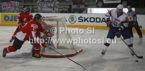 : David Rodman (no.12) of Slovenia (R) behind goal of Hungary during match of IIHF Ice hockey World championship Division 1 Group A between Slovenia and Hungary. Match between Slovenia and Hungary of IIHF Ice hockey World championship Division 1 Group A was held in Stozice Arena in Ljubljana, Slovenia, on Wednesday, 18th of April 2012.