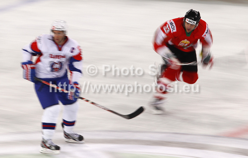 : Tomaz Razingar (no.9) of Slovenia (L) and Arpad Mihaly (no.23) of Hungary (R) during match of IIHF Ice hockey World championship Division 1 Group A between Slovenia and Hungary. Match between Slovenia and Hungary of IIHF Ice hockey World championship Division 1 Group A was held in Stozice Arena in Ljubljana, Slovenia, on Wednesday, 18th of April 2012.