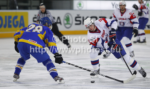 Ljubljana ,Slovenia - 19.04.2012 : Ziga Jeglic (no.8) of Slovenia (R) and Vitaliy Liutkevyich (no.28) of Ukraine (L) during match of IIHF Ice hockey World championship Division 1 Group A between Slovenia and Ukrain. Match between Slovenia and Ukrain of IIHF Ice hockey World championship Division 1 Group A was held in Stozice Arena in Ljubljana, Slovenia, on Thursday, 19th of April 2012. Photo by: Primoz Jeroncic