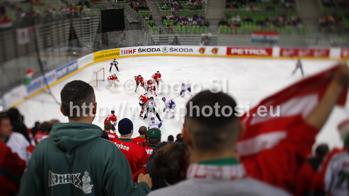 : Players of Great Britain and Hungary during match of IIHF Ice hockey World championship Division 1 Group A between Great Britain and Hungary. Match between Great Britain and Hungary of IIHF Ice hockey World championship Division 1 Group A was held in Stozice Arena in Ljubljana, Slovenia, on Saturday, 21st of April 2012.