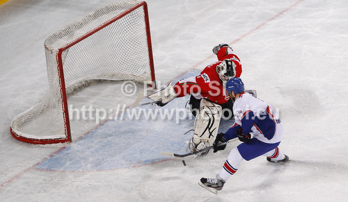 : Robert Dowd (no.12) of Great Britain scoring from penalty shot during match of IIHF Ice hockey World championship Division 1 Group A between Great Britain and Hungary. Match between Great Britain and Hungary of IIHF Ice hockey World championship Division 1 Group A was held in Stozice Arena in Ljubljana, Slovenia, on Saturday, 21st of April 2012.
