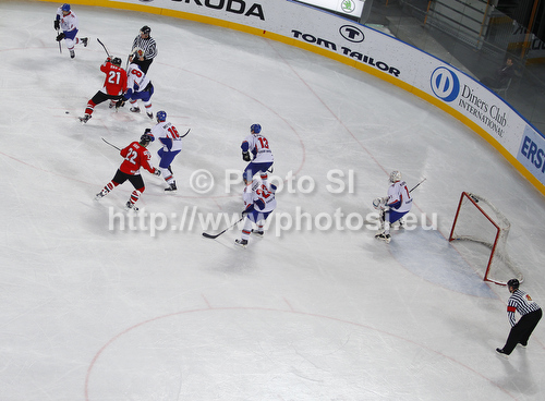 : Players of Great Britain and Hungary during match of IIHF Ice hockey World championship Division 1 Group A between Great Britain and Hungary. Match between Great Britain and Hungary of IIHF Ice hockey World championship Division 1 Group A was held in Stozice Arena in Ljubljana, Slovenia, on Saturday, 21st of April 2012.