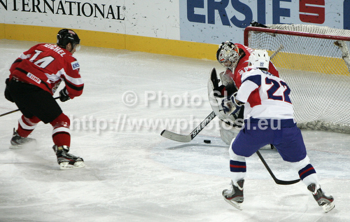 Ljubljana ,Slovenia - 21.04.2012 : Fabian Weinhandl (no.1) of Austria and Rok Pajic (no.27) of Slovenia during match of IIHF Ice hockey World championship Division 1 Group A between Slovenia and Austria. Match between Slovenia and Austria of IIHF Ice hockey World championship Division 1 Group A was held in Stozice Arena in Ljubljana, Slovenia, on Saturday, 21st of April 2012. Photo by: Leena Jeroncic