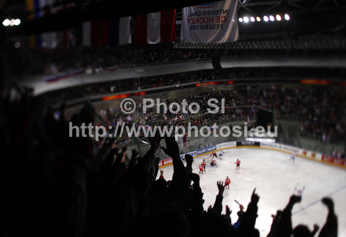 : Spectators in arena celebrating goal of Slovenia during match of IIHF Ice hockey World championship Division 1 Group A between Slovenia and Austria. Match between Slovenia and Austria of IIHF Ice hockey World championship Division 1 Group A was held in Stozice Arena in Ljubljana, Slovenia, on Saturday, 21st of April 2012.