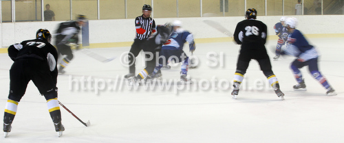: Players of Stavanger Oilers and VSV Villach in bully during match of Rudi Hiti Ice hockey Summer league 2012 between Stavanger Oilers, Norway, and VSV Villach, Austria. Match between Stavanger Oilers and VSV Villach was held in Bled Ice Arena in Bled, Slovenia, on Friday, 17th of August 2012.