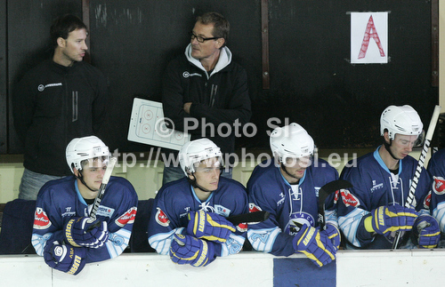 : Hannu Jarvenpaa Head Coach of VSV VIllach (R) and Assistant Coach Marc Brown (L) during match of Rudi Hiti Ice hockey Summer league 2012 between Stavanger Oilers, Norway, and VSV Villach, Austria. Match between Stavanger Oilers and VSV Villach was held in Bled Ice Arena in Bled, Slovenia, on Friday, 17th of August 2012.