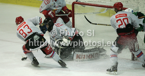 : Saso Rajsar of HK Acroni Jesenice (83), Ales SIla of HK Acroni Jesenice (1) and Martin Potocnik of HK Acroni Jesenice (20) during match of Rudi Hiti Ice hockey Summer league 2012 between HK Acroni Jesenice and HDD Telemach Olimpija. Match between HK Acroni Jesenice and HDD Telemach Olimpija was held in Bled Ice Arena in Bled, Slovenia, on Friday, 17th of August 2012.