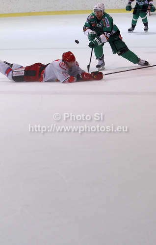 : Ales Music of HDD Telemach Olimpija (R) and Nejc Berlisk of HK Acroni Jesenice (L) during match of Rudi Hiti Ice hockey Summer league 2012 between HK Acroni Jesenice and HDD Telemach Olimpija. Match between HK Acroni Jesenice and HDD Telemach Olimpija was held in Bled Ice Arena in Bled, Slovenia, on Friday, 17th of August 2012.