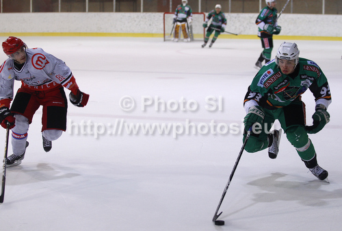 : Miha Pesjak of HDD Telemach Olimpija (R) and Luka Tosic of HK Acroni Jesenice (L) during match of Rudi Hiti Ice hockey Summer league 2012 between HK Acroni Jesenice and HDD Telemach Olimpija. Match between HK Acroni Jesenice and HDD Telemach Olimpija was held in Bled Ice Arena in Bled, Slovenia, on Friday, 17th of August 2012.