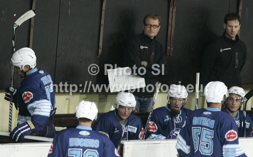 : Hannu Jarvenpaa Head Coach of VSV VIllach (L) and Assistant Coach Marc Brown (R) and during match of Rudi Hiti Ice hockey Summer league 2012 between VSV Villach and KHL Medvescak Zagreb. Match between VSV Villach and KHL Medvescak Zagreb was held in Bled Ice Arena in Bled, Slovenia, on Saturday, 18th of August 2012.