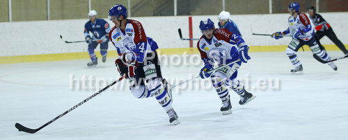 : Geoff Waugh of KHL Medvescak (L) leading puck out of KHL Medvescaks defense third during match of Rudi Hiti Ice hockey Summer league 2012 between VSV Villach and KHL Medvescak Zagreb. Match between VSV Villach and KHL Medvescak Zagreb was held in Bled Ice Arena in Bled, Slovenia, on Saturday, 18th of August 2012.
