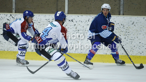 : Nikolaus Hartl of VSV Villach (R) searching of teammate to pass puck during match of Rudi Hiti Ice hockey Summer league 2012 between VSV Villach and KHL Medvescak Zagreb. Match between VSV Villach and KHL Medvescak Zagreb was held in Bled Ice Arena in Bled, Slovenia, on Saturday, 18th of August 2012.