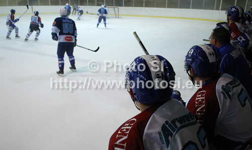 : Players of KHL Medvescak observing play during match of Rudi Hiti Ice hockey Summer league 2012 between VSV Villach and KHL Medvescak Zagreb. Match between VSV Villach and KHL Medvescak Zagreb was held in Bled Ice Arena in Bled, Slovenia, on Saturday, 18th of August 2012.